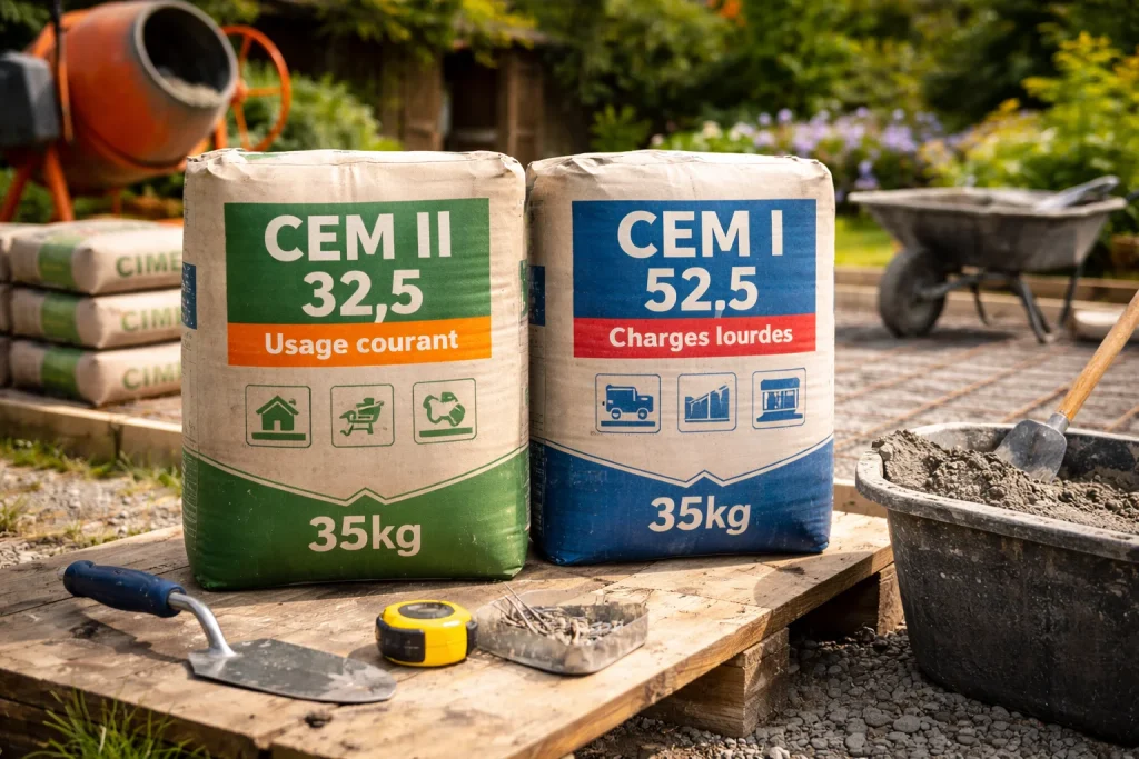 Tous les ciments ne se valent pas. Sur le marché, tu trouveras principalement le CEM I (ciment Portland pur) et le CEM II (ciment Portland composé). Pour une dalle de jardin ou de garage, le CEM II convient parfaitement. Il est moins cher et largement suffisant pour un usage domestique courant.